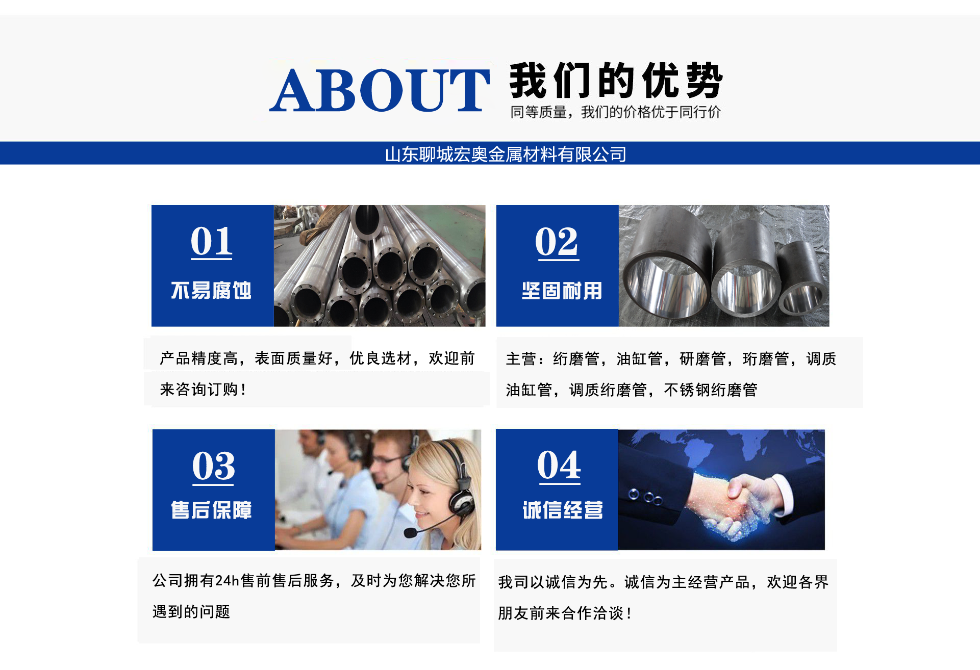 山東聊城宏奧金屬材料有限公司位于風景秀麗的江北水城-聊城。地理位置優(yōu)越,交通便利。主營絎磨管,油缸管,研磨管,珩磨管,調質油缸管,調質絎磨管,不銹鋼絎磨管等產品 廣泛應用于礦山、起重、船舶、煤炭、運輸、化工、科研、軍工等工業(yè)領域。 公司憑借雄厚的實力,豐富齊全的規(guī)格品種,完善的質量保證,合理的價格,優(yōu)質的服務,不斷地受到新老用戶及業(yè)內人士的肯定和信任,我們本著及用戶之所及,想用戶之所想的服務宗旨不斷地拼搏,進取,在此對多年來支持我們的各行各業(yè)的新老朋友表示由衷的感謝,愿我們今后的合作更加愉快! 歡迎國內外新老客戶來公司視察、蒞臨指導工作!...